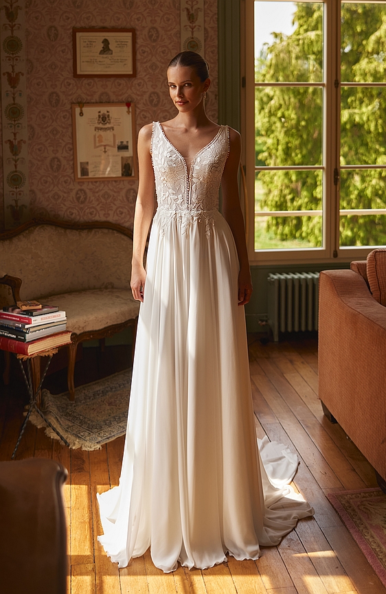 Jednoduché svadobné šaty 1002 s padavou sukňou a krásnou čipkou – ľahké svadobné šaty, v ktorých pretancujete celú noc. Svadobné šaty Elizabeth Passion 1002 nájdete v našej novej kolekcii svadobných šiat na prenájom a predaj.