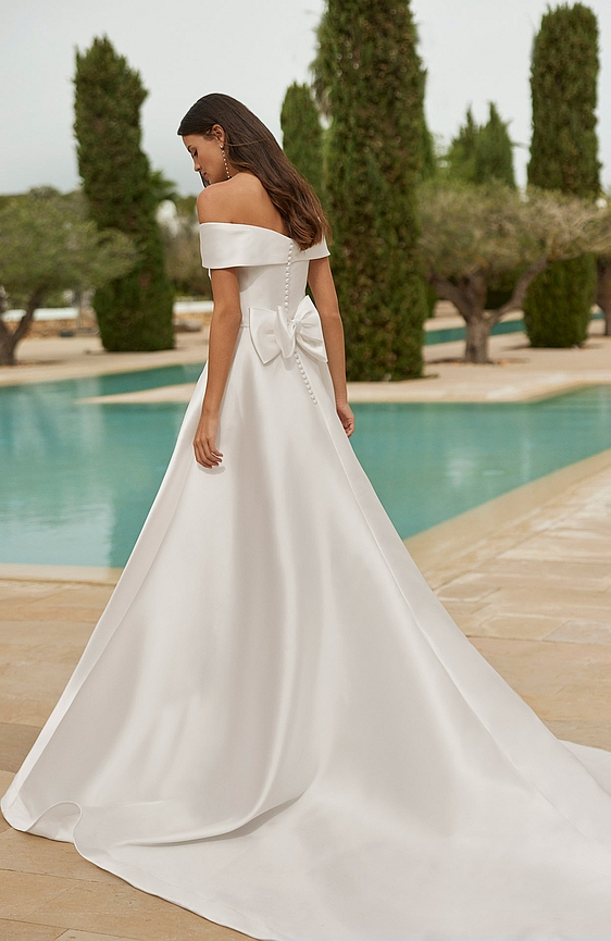 Svadobné šaty SULINA – jednoduché svadobné šaty z luxusného mikáda s lodičkovým výstrihom – maximálne elegantný model pre váš deň D. Svadobné šaty SULINA nájdete v našej novej kolekcii svadobných šiat na prenájom a predaj. Príďte si ich vyskúšať!